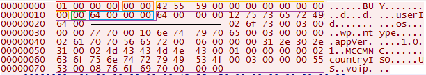 { u'ntype':3, u'countryISO':u'US', u'userId':XXXXXXXX L, u'MCCMNC':u'', u'appVer':u'1.0.1', u'os':u'wp', u'voip':False } |